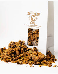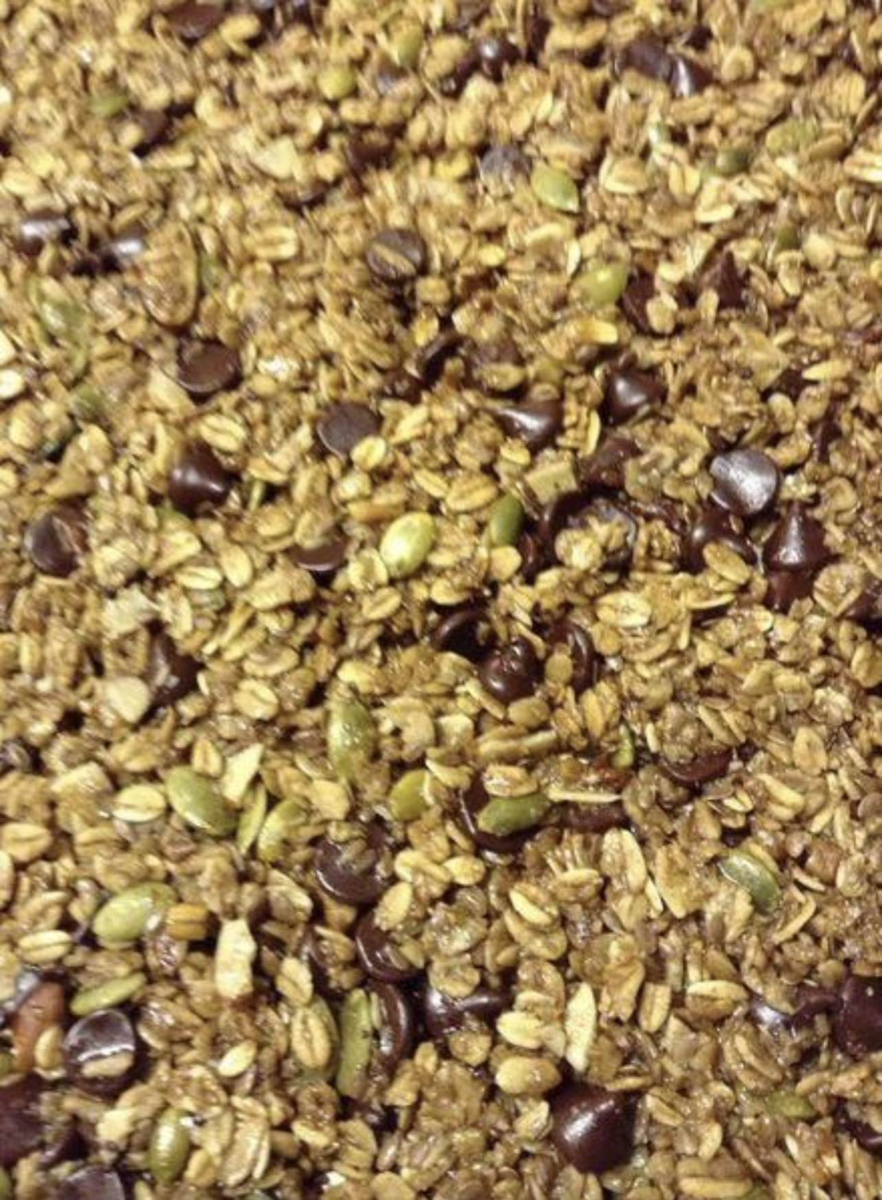63% extra dark chocolate chips perfectly blended with nutritious oats, raw sugar, pumpkin & flax seed, nuts & spices and love into a decadent, vegan snack.